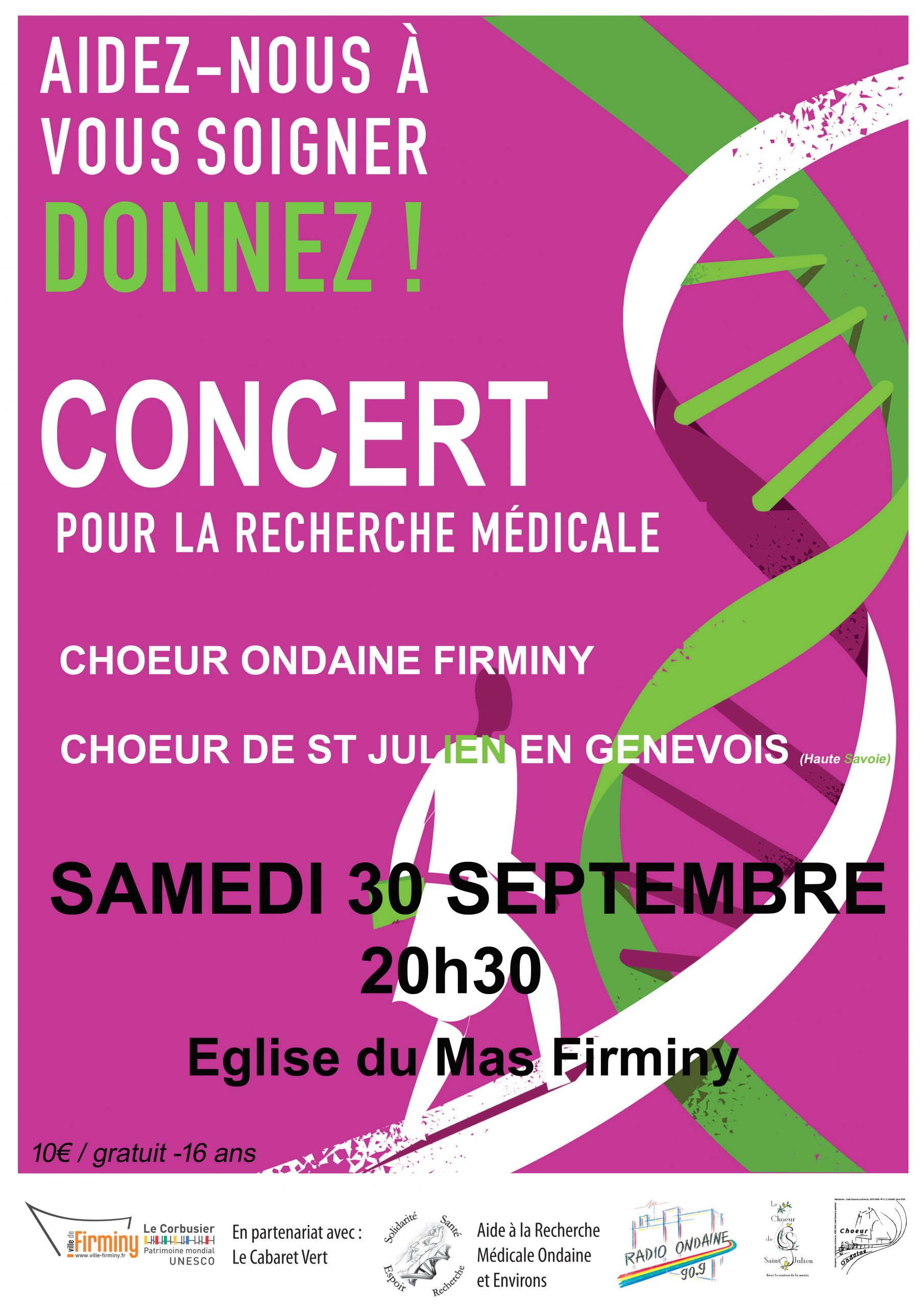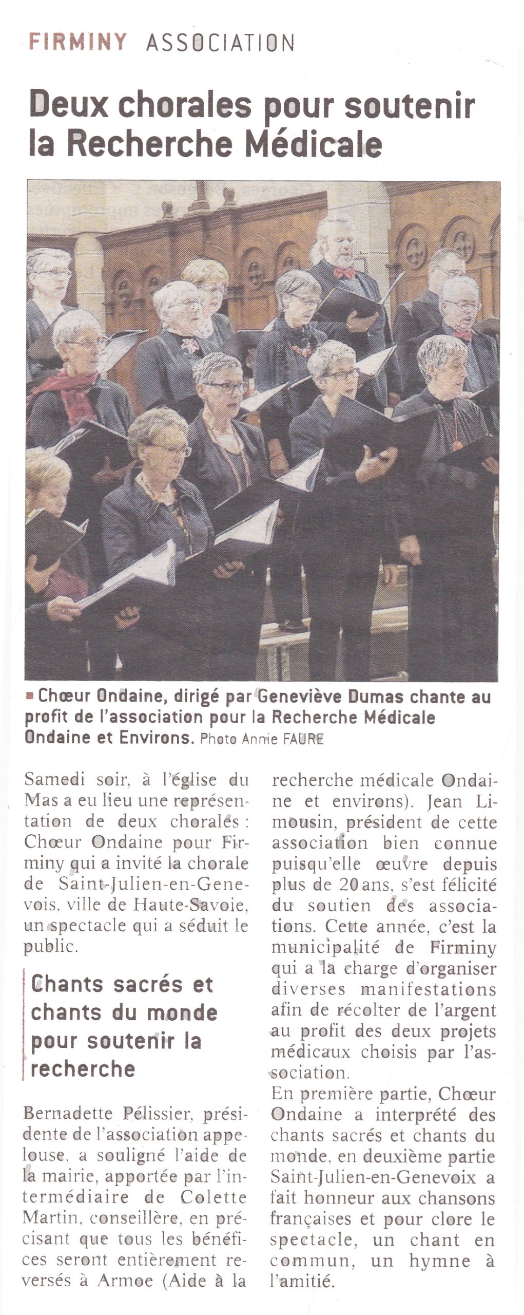Samedi 30 septembre, à l’Eglise du mas de Firminy, à 20h30, Chœur Ondaine et le Chœur de St Julien en Genevois (Haute Savoie) ont donné un concert caritatif au profit de la recherche médicale. Un beau moment de partage avec le Chœur de Saint-Julien en Genevois devant un public conquis.